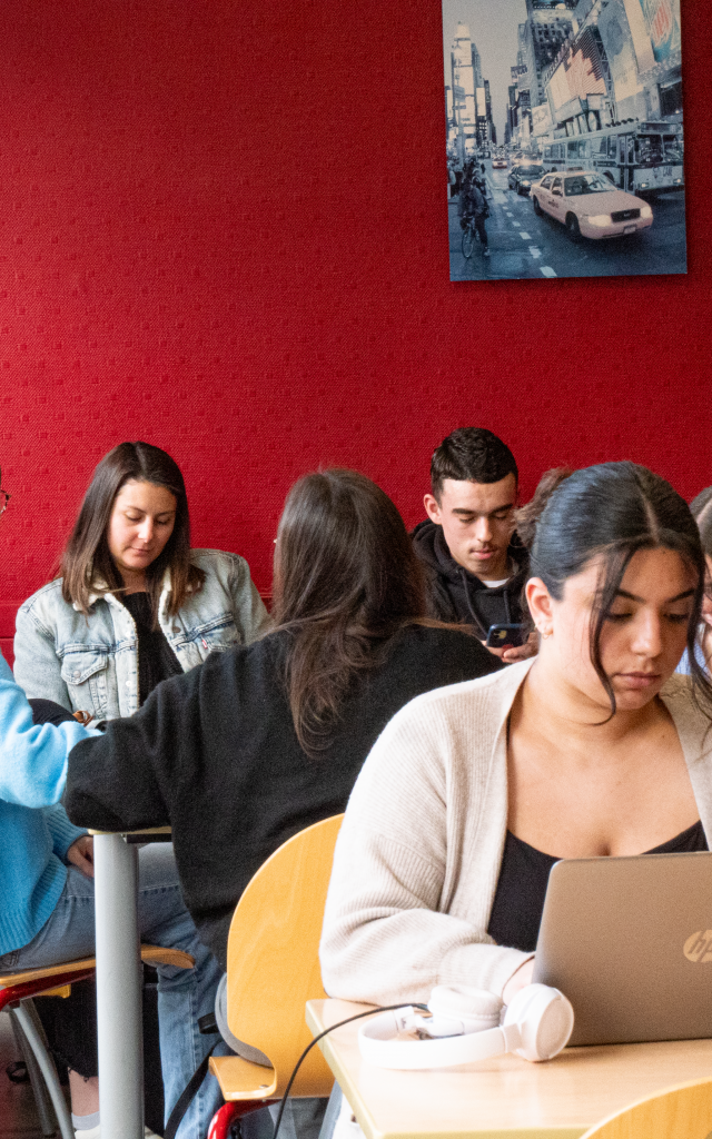 L’espace étudiants est un endroit clair et agréable, cloisonné par des claustras où les élèves et étudiants peuvent se retrouver pour réviser leurs cours ou travailler en groupes.